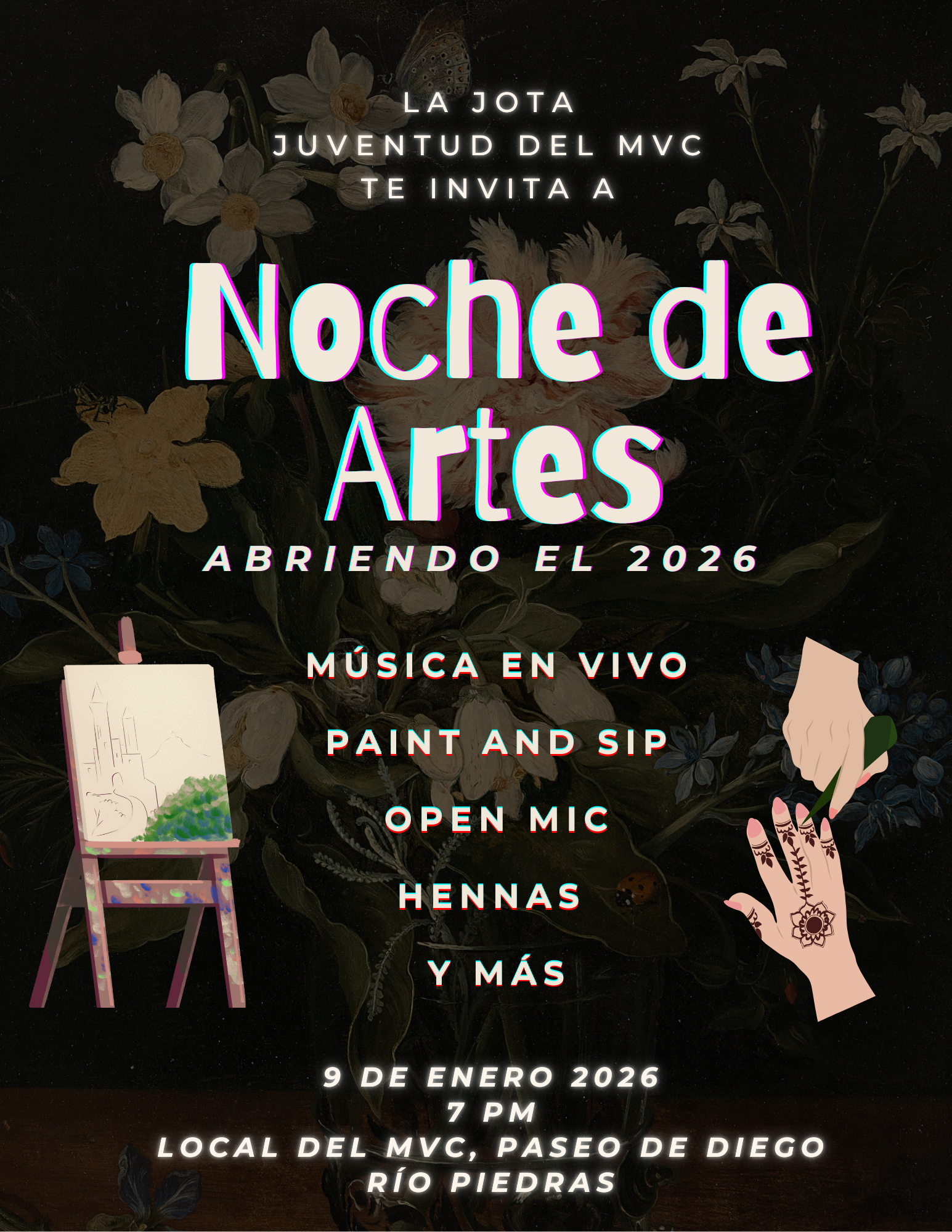 ¡Abre el año 2026 con creatividad! El producir arte es un acto político, especialmente cuando se hace en comunidad. Por eso La Jota te invita a la Noche de Artes donde podrás disfrutar de la clase de "sip and paint", música en vivo, mesa de henna, open mic y más.